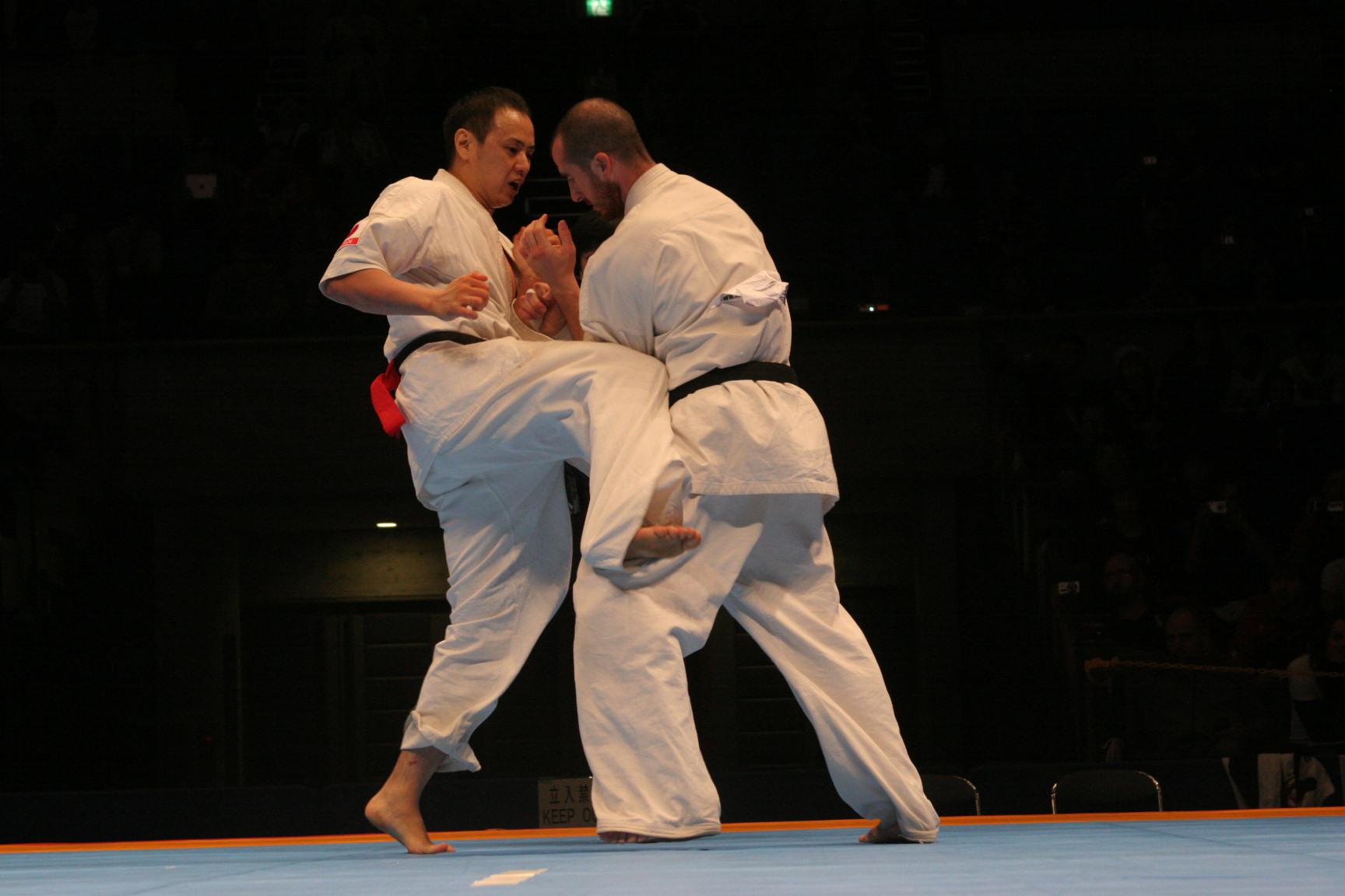 纐纈卓真(左)は今回4度目の対戦となったライバルのジョナサン・ティネオ(右・スペイン)を中段膝で効かし試合を優位に展開。最後は試割り判定にもつれるも板1枚の差で世界大会2連覇を達成!